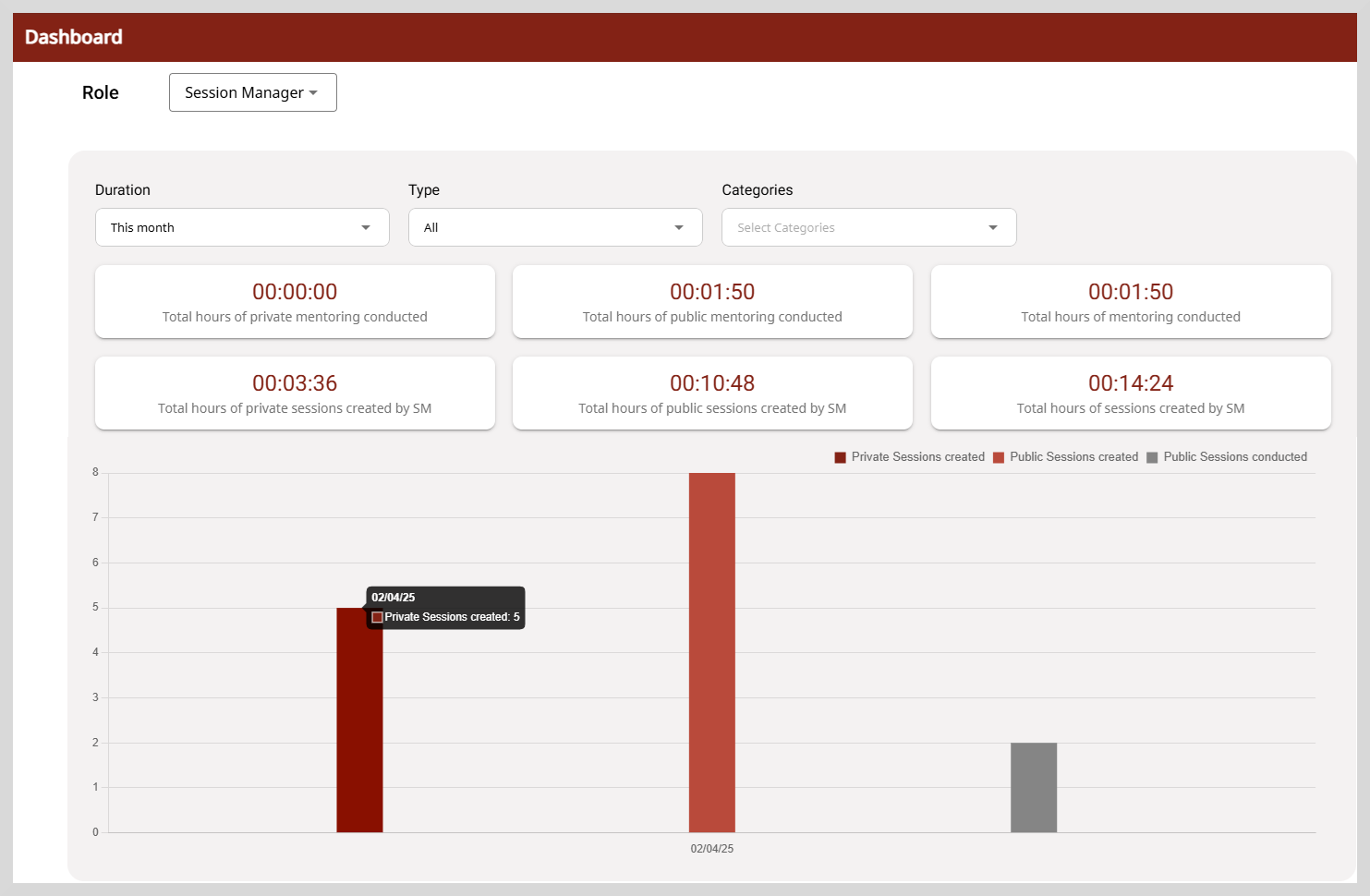 By default, the dashboard displays the mentoring session details for a mentee. You need to change the role to session manager. To change to session manager, select the Session Manager role from the Role dropdown.